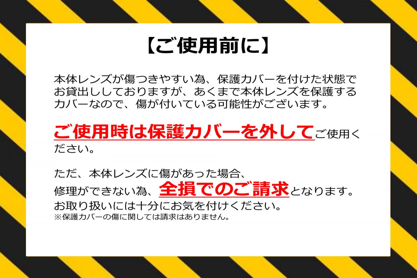 - 本体レンズが傷つきやすい為、保護カバーを付けた状態でお貸出ししておりますが、あくまで本体レンズを保護するカバーなので、傷が付いている可能性がございます。